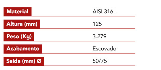Produto fabricado em aço inoxidável AISI 316L, com