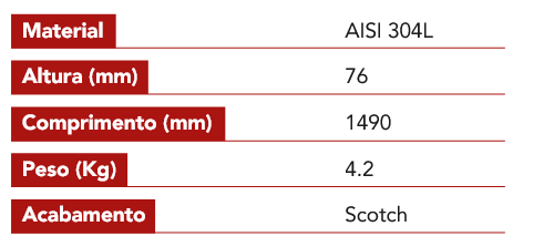 Canalina NOXON® com ranhura de 15mm. Fabricada em aço inoxidável AISI 304L. Peça de 1490mm de comprimento e altura de ligação 76mm. Acabamento superficial em scotch. Incluído juntas de neoprene.