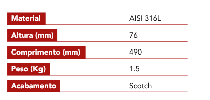 Canalina NOXON® com ranhura de 15mm. Fabricada em aço inoxidável AISI 316L. Peça de 490mm de comprimento e altura de ligação 76mm. Acabamento superficial em scotch. Incluído juntas de neoprene.